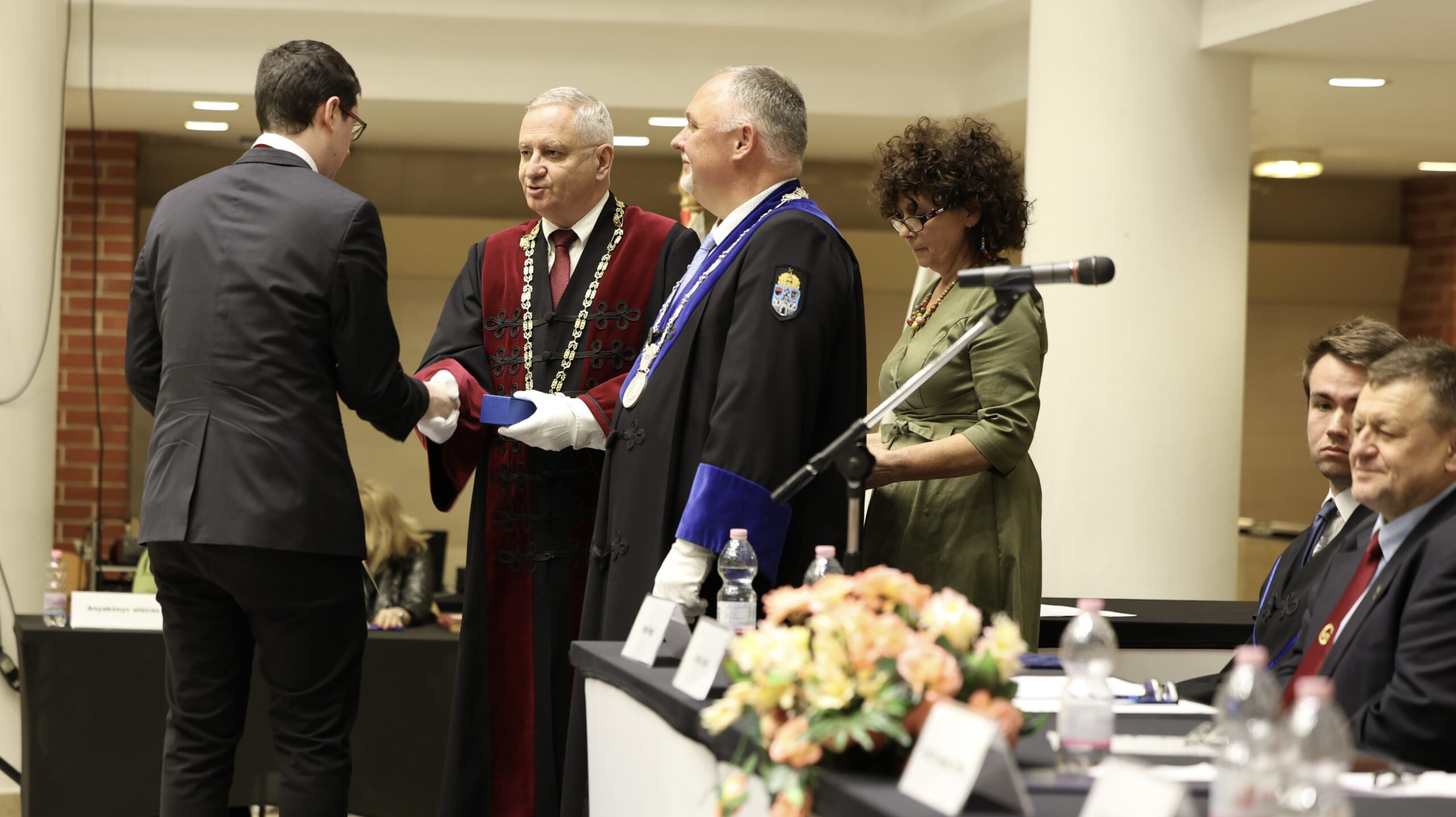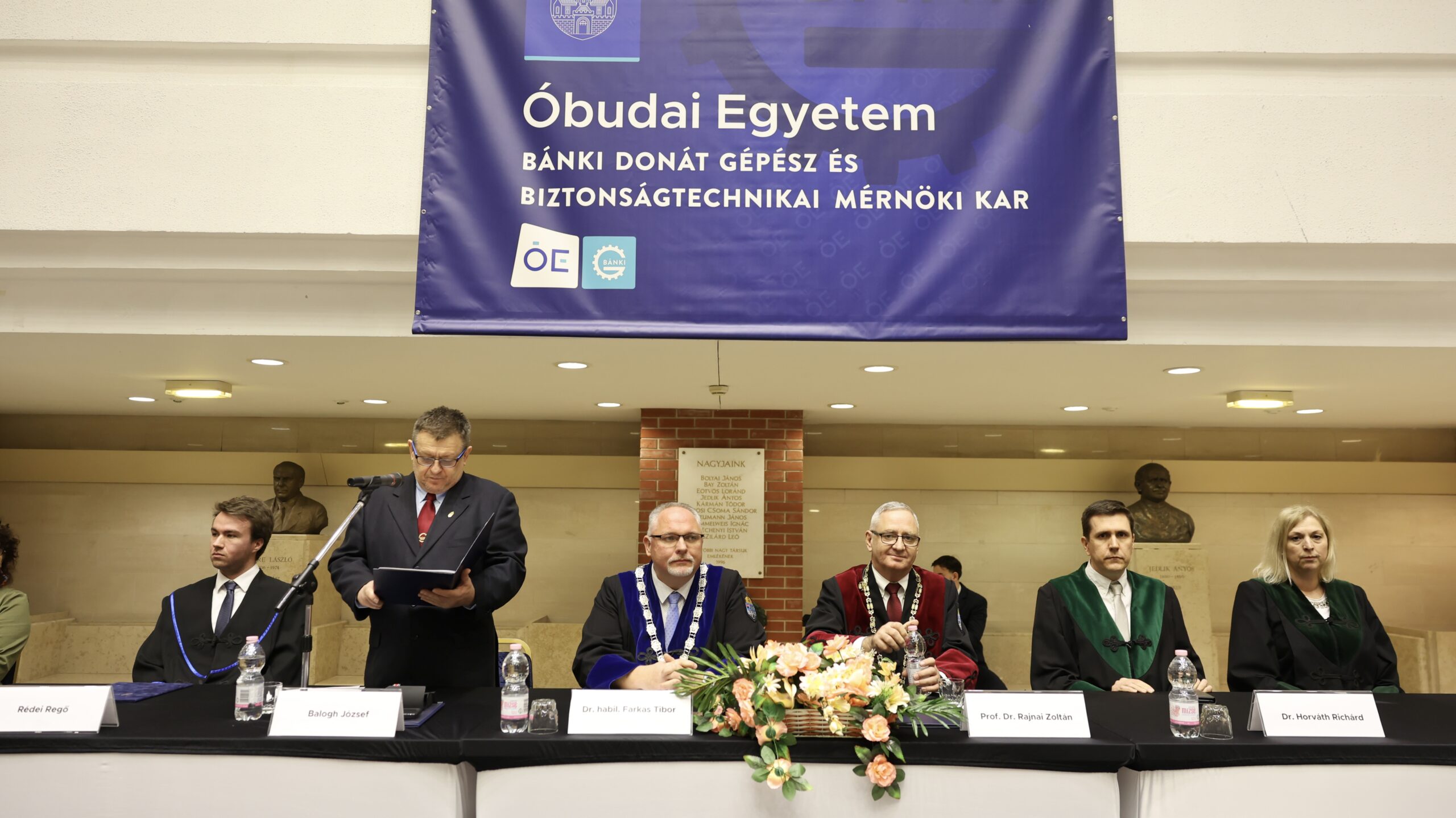 A már megszokott Gaudeamus dallamára bevonuló elnökség tagjai voltak: Prof. Dr. Rajnai Zoltán általános rektorhelyettes, Dr. habil Farkas Tibor dékán, Prof. Dr. Kovács Tünde oktatási dékánhelyettes, Dr. Horváth Richárd kutatási dékánhelyettes, Balogh József dékáni titkárságvezető – egyben levezető elnök és Rédei Regő, a Halgatói Önkormányzat Elnöke.
