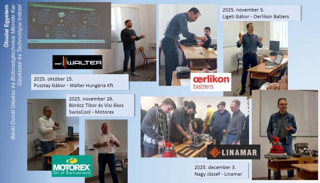 2025. október 15-én a Szerszámozási ismeretek tantárgy keretében Pusztay Gábor, a Walter Hungária Kft. munkatársa tartott előadást a gépészmérnök alapképzés CAD/CAM/CNC specializációján tanuló hallgatóknak. Előadásában bemutatta a cég legújabb fejlesztéseit a fúró- és marószerszámok területén, valamint ipari példákkal és esettanulmányokkal szemléltette a megfelelő szerszámválasztás jelentőségét. A műszaki tartalom mellett a technológiai tervezés gazdasági vonatkozásaira is felhívta a figyelmet.
