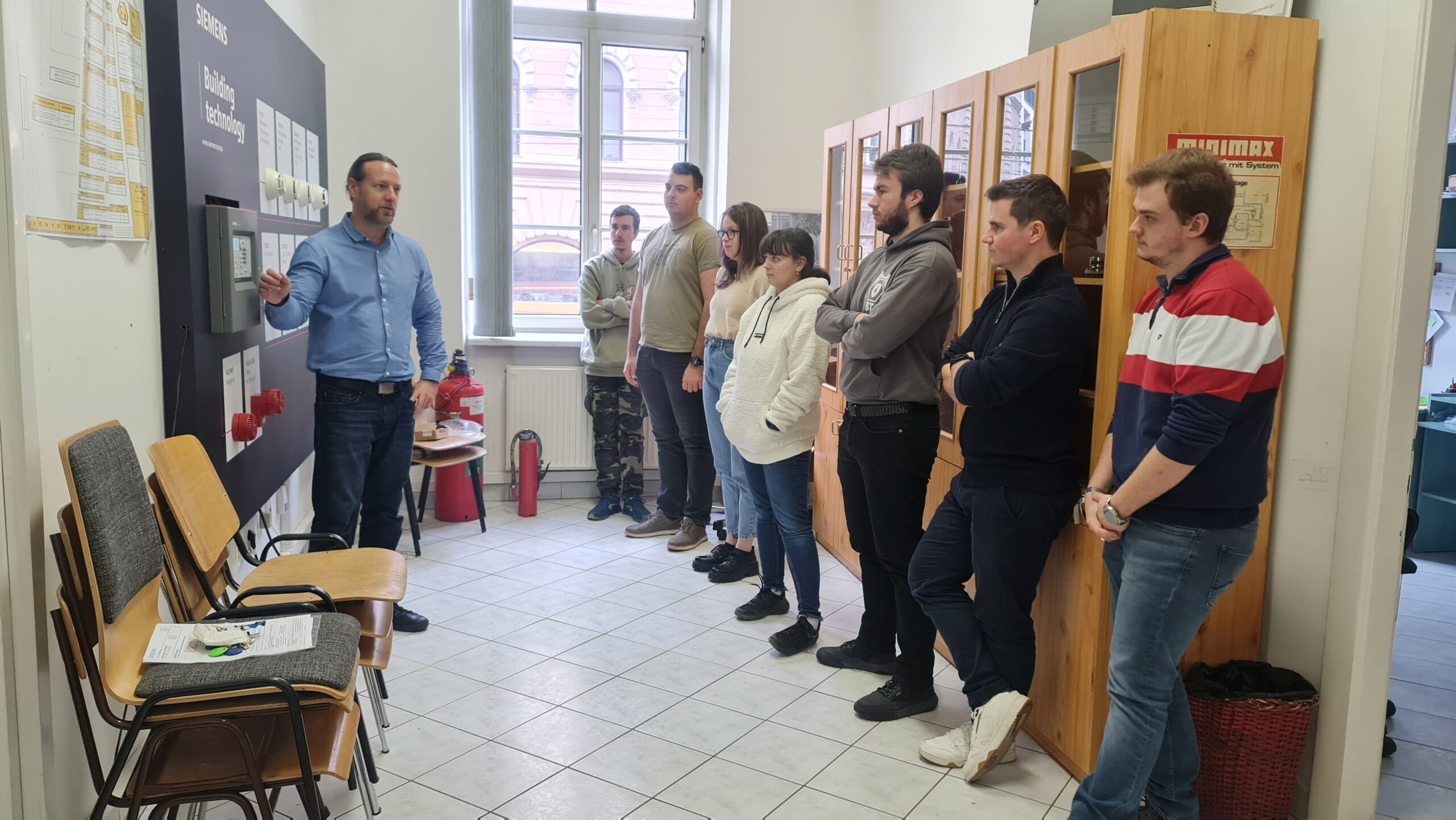 Hallgatóink a Siemens szakemberével, Tóth Gergellyel és Dr. Mohai Ágota adjunktussal közösen beüzemelték és konfigurálták a Cerberus FIT FC360-as tűzjelző rendszer oktatási tablót a Bánki EHS Laborban.